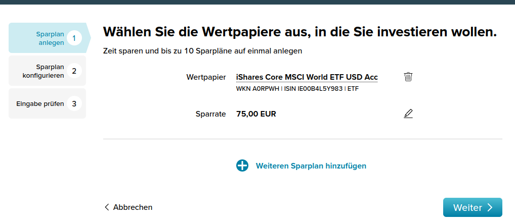 Dann kann man den ETF angeben. Am einfachsten ist es, sich die Isin oder WKN Nummer von justEFT zu kopieren und dann in die Maske eintragen. Als Sparrate habe ich 75€ gewählt.