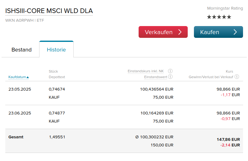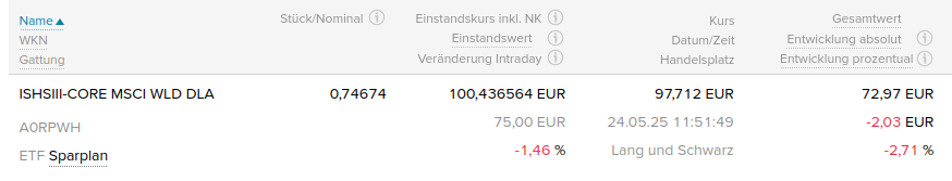 Im Depot sieht man dann, dass ich nicht einen Anteil besitze, sondern nur 0.74. Bei Aktien kaufe ich immer ganze Anteile. Beim Sparplan gibt es aber auch Teile davon.