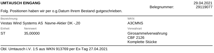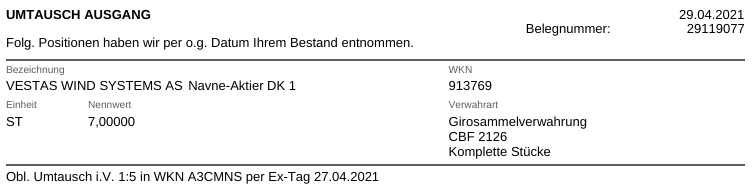 Bei Vestas bekam man nicht einfach ein paar Aktien dazu, sondern es wurde eine neue WKN eingeführt. So bekam ich eine Ausbuchung meiner alten Aktien mit der WKN 913769